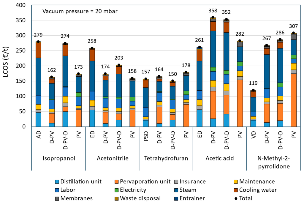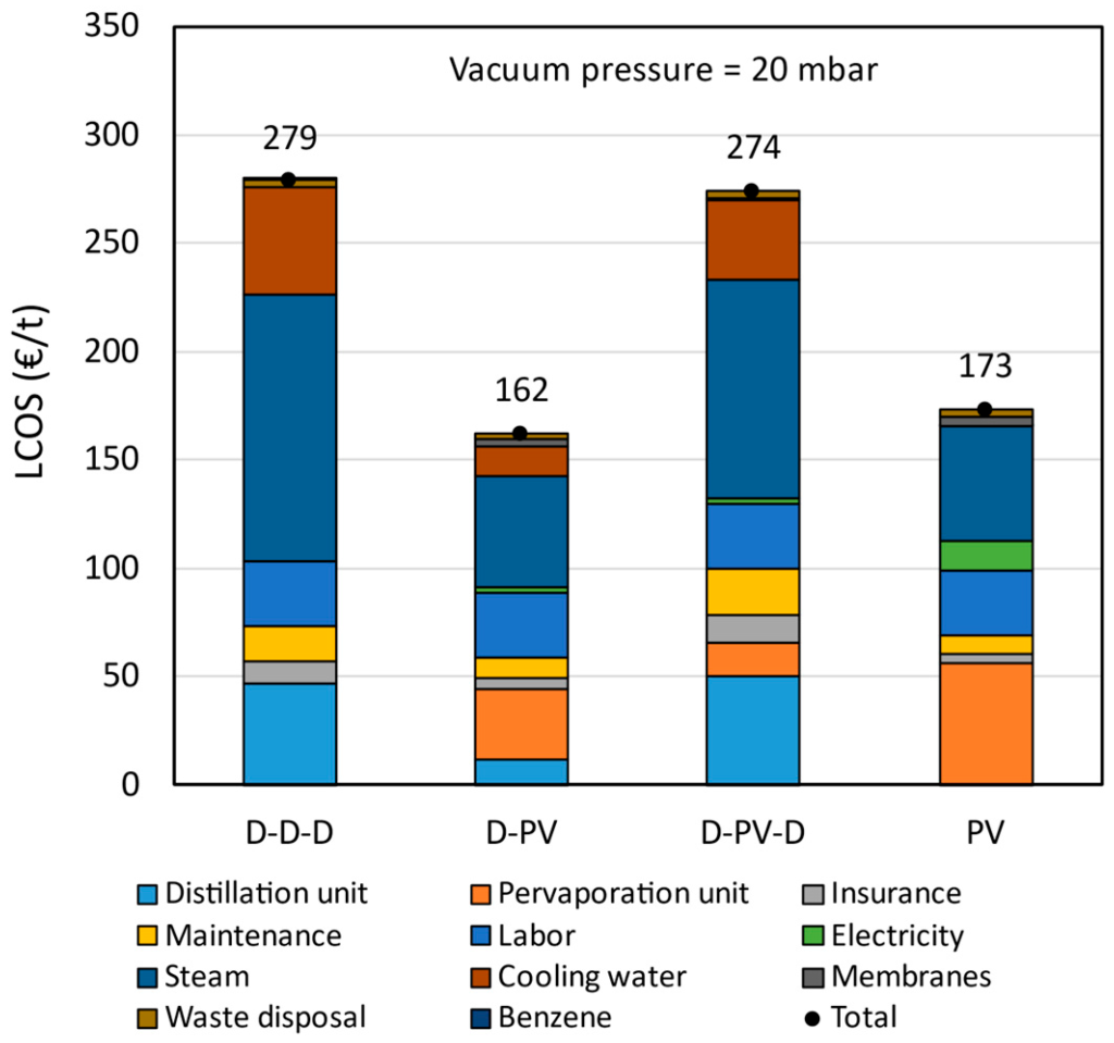 Efficient water removal by membranes avoids possible azeotropes in downstream distillation units making them much simpler, reducing considerably the unit sizes and the energy demand (40% lower).